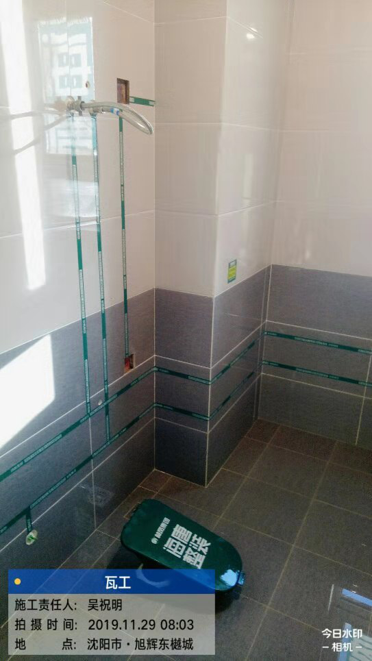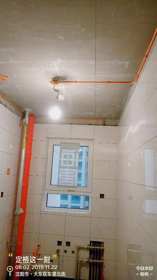 现在是房子装修的瓦工验收阶段,墙砖无空鼓开裂现象,卫生间采光好所以选用上浅下深的AB版,美观的同时更突出个性,厨房烟道逆止阀严实无缝周围用水泥砂浆固定,防止烟道反味。